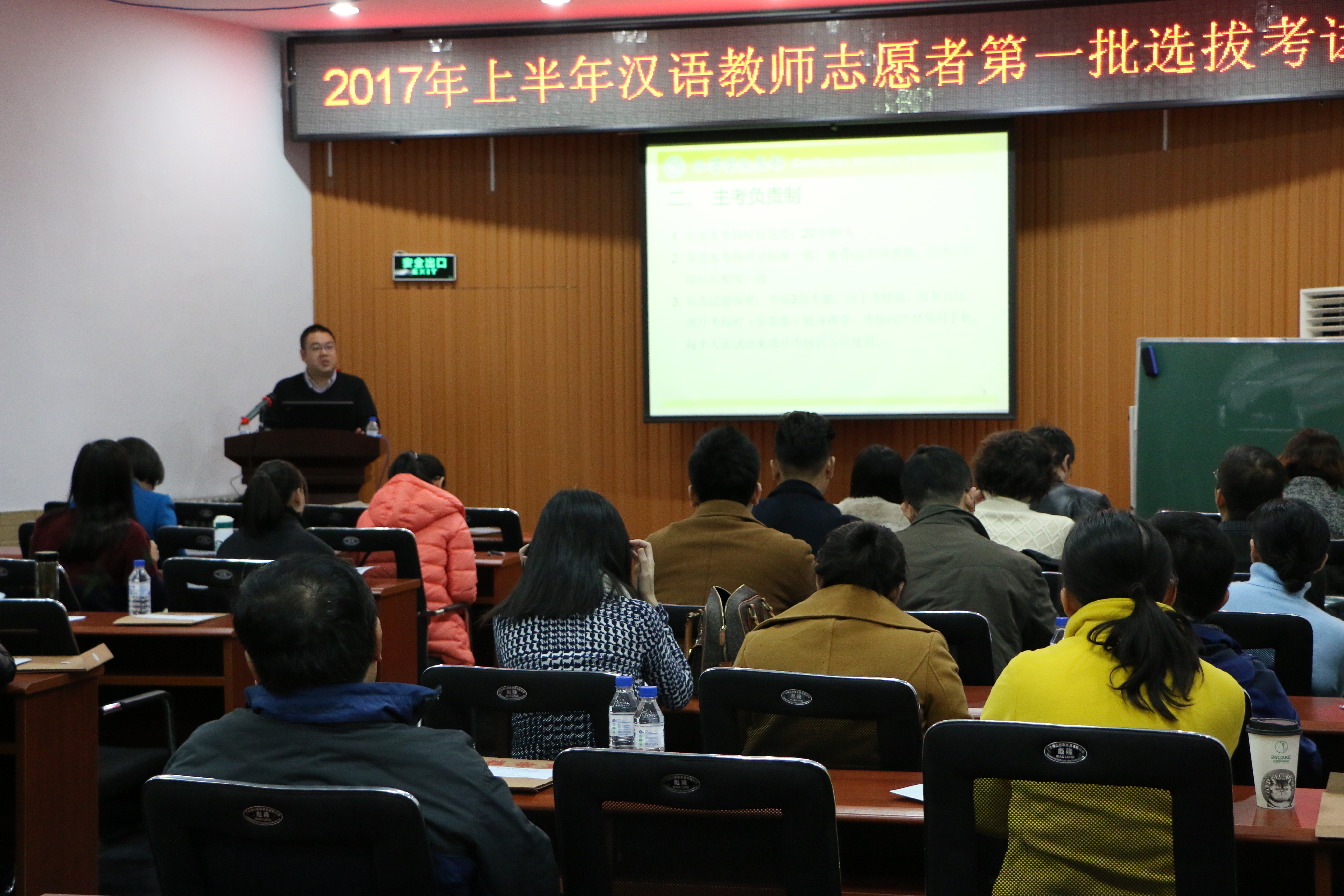 承办了本次考试的筹备组织工作。国家汉办志愿者工作处工作人员作为督考并提前对考官、考务人员和学生志愿者进行了培训。来自校内外的21位综合考官、9位外语考官及42名考务人员在经培训后参与了本次选拔考试工作。