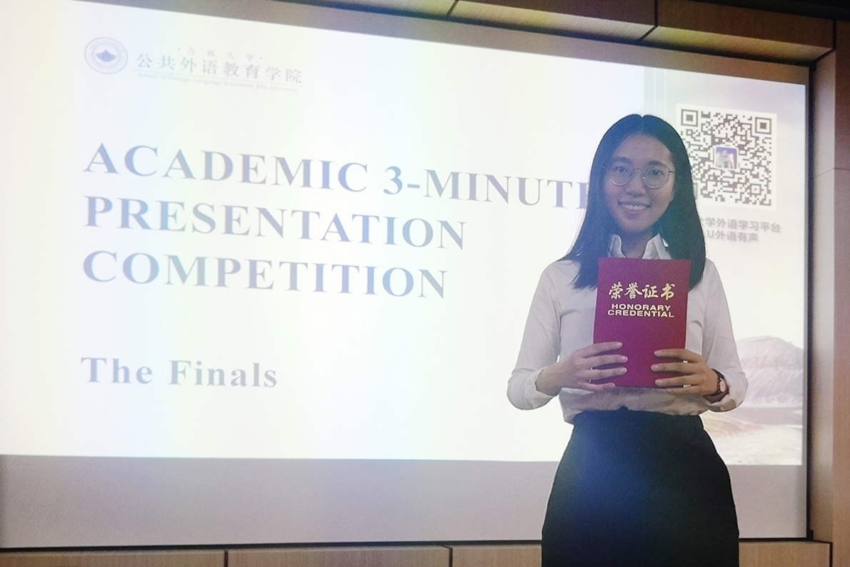 硕士研究生李东琪同学表现突出,摘得桂冠。此次大赛是吉林大学为提升学生学术英语技能和国际学术交流能力,推动“双一流”建设与国际化进程举办的竞赛活动,大赛在吉林大学教务处和研究生院的大力支持下,由公共外语教育学院主办。