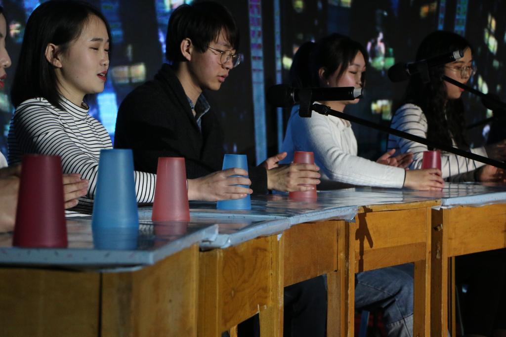 富育红老师和刘馥萱同学合作带来的歌曲《两个异次元少女的愿望》,悠扬婉转而又活泼可爱,大屏幕上投放着老师和同学们的互动故事,一曲《水调歌头》串联起点滴回忆,也拥紧了师生的心。张雪杨等四位同学带来激情澎湃的诗朗诵《可爱的祖国》,现场观众深受鼓舞;接着是轻松愉悦的团体舞蹈《Holiday》,赵宇玺等六位同学跳出了青春活力,也舞出了吉大外交学子的风采。随后,18级全体研究生为大家带来别具一格的表演《Cups》,可谓匠心独具,异彩纷呈。