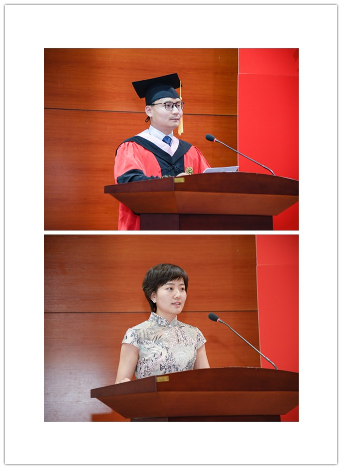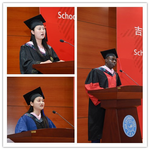 接下来,本科毕业生代表张恒同学、硕士研究生代表戴淑婷同学和留学生毕业生代表小布同学分别发言,代表自己的同学抒发毕业感言。张恒同学说到珍贵的大学时光为同学们与众不同的精彩人生注入了无限的力量,感谢学院赋予了学生逐梦的翅膀,感谢母校为学生们提供了追梦的平台。她勉励同学们在今后的学习和生活中不忘初心,不断突破自我,在治学、处事、为人各方面超越昨天的自己,开启全新的旅程。戴淑婷同学在发言中感慨学院日新月异的蓬勃发展,她表示学院不仅教会学生知识,还为同学们提供了一个多民族、多文化的国际化交流与对话平台,让学生们了解不同民族、宗教与文化,能够以更广博的眼光、更谦逊的态度去看待这个世界。学院教会学生们要常怀对知识、对世界的敬畏之心,这些来自学院各位老师的栽培将是学生们一生中最宝贵的财富。来自加纳的博士研究生小布(BRIGHT LUMOR MENSAH)同学代表毕业留学生感谢学院和吉林大学为他们提供的优质教育,感谢学院教师和工作人员的辛勤付出。他表示在生活的这所大学里永远没有毕业,今天学业上的结束是明天事业的开始,无论以后回国后从事什么工作,都要铭记母校的教诲,为两国人民的友好交流做出贡献。乔蕊老师作为教师代表在讲话中感慨万千,对即将毕业的各位同学表达了祝贺与祝福,她回顾了自己的求学生涯和与学生们共同学习相处的美好时光,鼓励毕业生们勇于开拓,不断创新,超越自我,书写自己人生的华章。