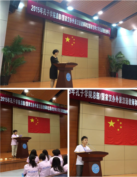 典礼在全体志愿者合唱歌曲“瀚宇之花盛开”中拉开序幕,大家皆被充满感情的歌声感染,再一次回味培训以来的点点滴滴。优秀外派教师培训学员大连外国语大学任晓丽老师和优秀汉语教师志愿者培训学员海南三亚琼州学院任德宇分别发言。他们代表全体学员对国家汉办、吉林大学、熟女