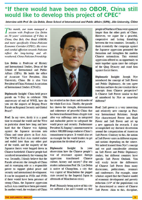 2015年9月5日,应巴基斯坦《外交视野》杂志的约请,刘德斌院长接受该杂志的采访请求,回答了关于中国纪念抗日战争暨世界反法西斯战争胜利七十周年大阅兵、中国软实力、中国的“一带一路”战略、中国的发展经验、中巴关系以及中巴经济走廊的前景等当下热门问题。采访全文刊登在该杂志今年第九期“北京大阅兵&中华人民共和国成立66周年”特刊的显要位置。本期杂志同时收录了熟女