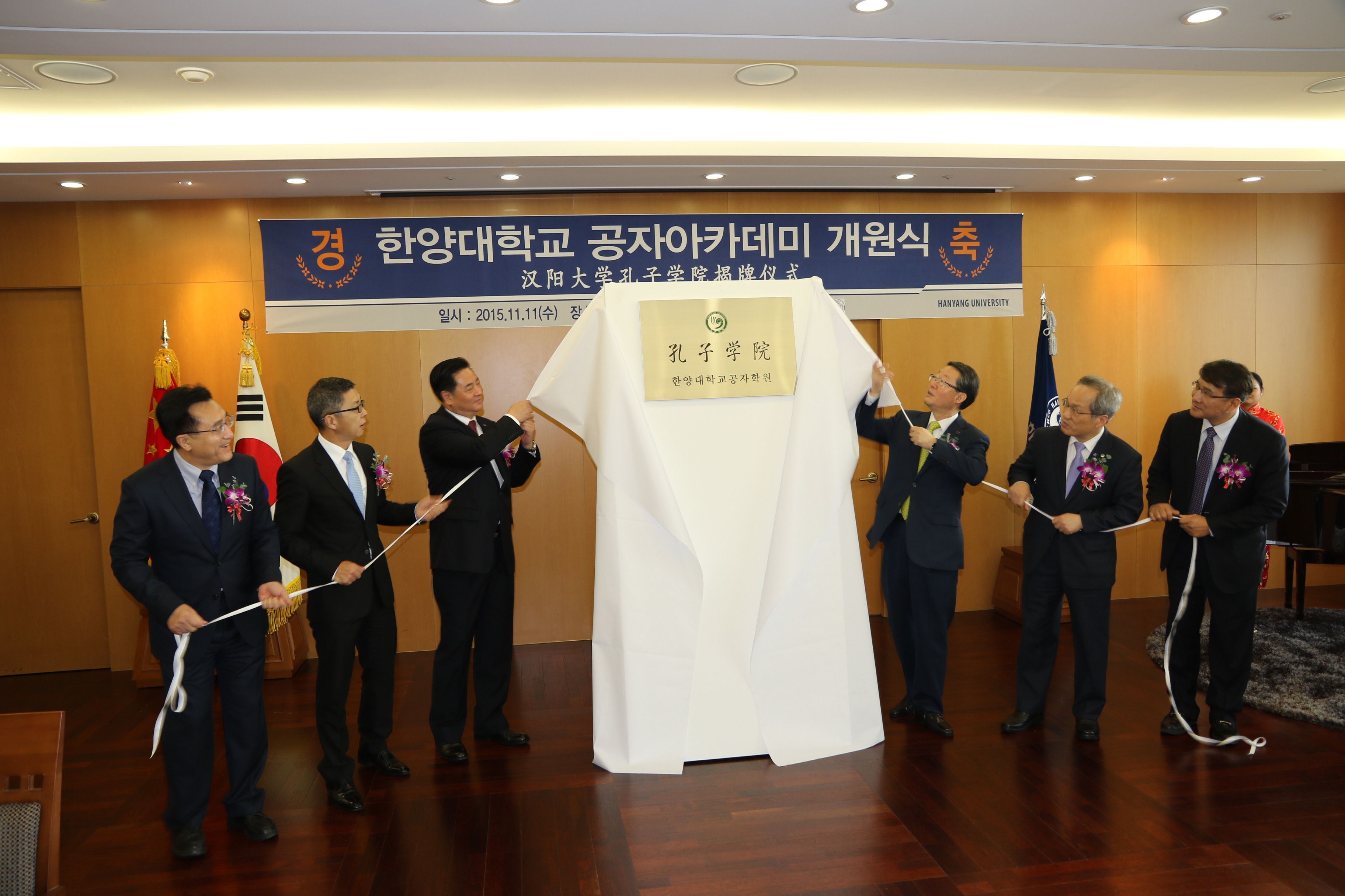 的相关负责同志出席了李校长汉阳大学名誉教授受聘仪式和孔子学院揭牌仪式。汉阳大学常务副校长金会律、副校长李承哲、国际交流处处长李基晶、国际语学院院长兼孔子学院韩方院长徐元南和国际学大学院院长兼中国问题研究所所长文兴镐等出席了揭牌仪式,并和李校长等一起为孔子学院剪彩。韩国其他大学孔院的中外方院长及汉阳大学国际语学院的中文教师和学生代表共一百余人出席了汉阳大学孔子学院的揭牌仪式。揭牌仪式后,两校还共同召开了汉阳大学孔子学院理事会首次工作会议,就今后的工作进行了细致的讨论,并通过了一系列章程和规定。