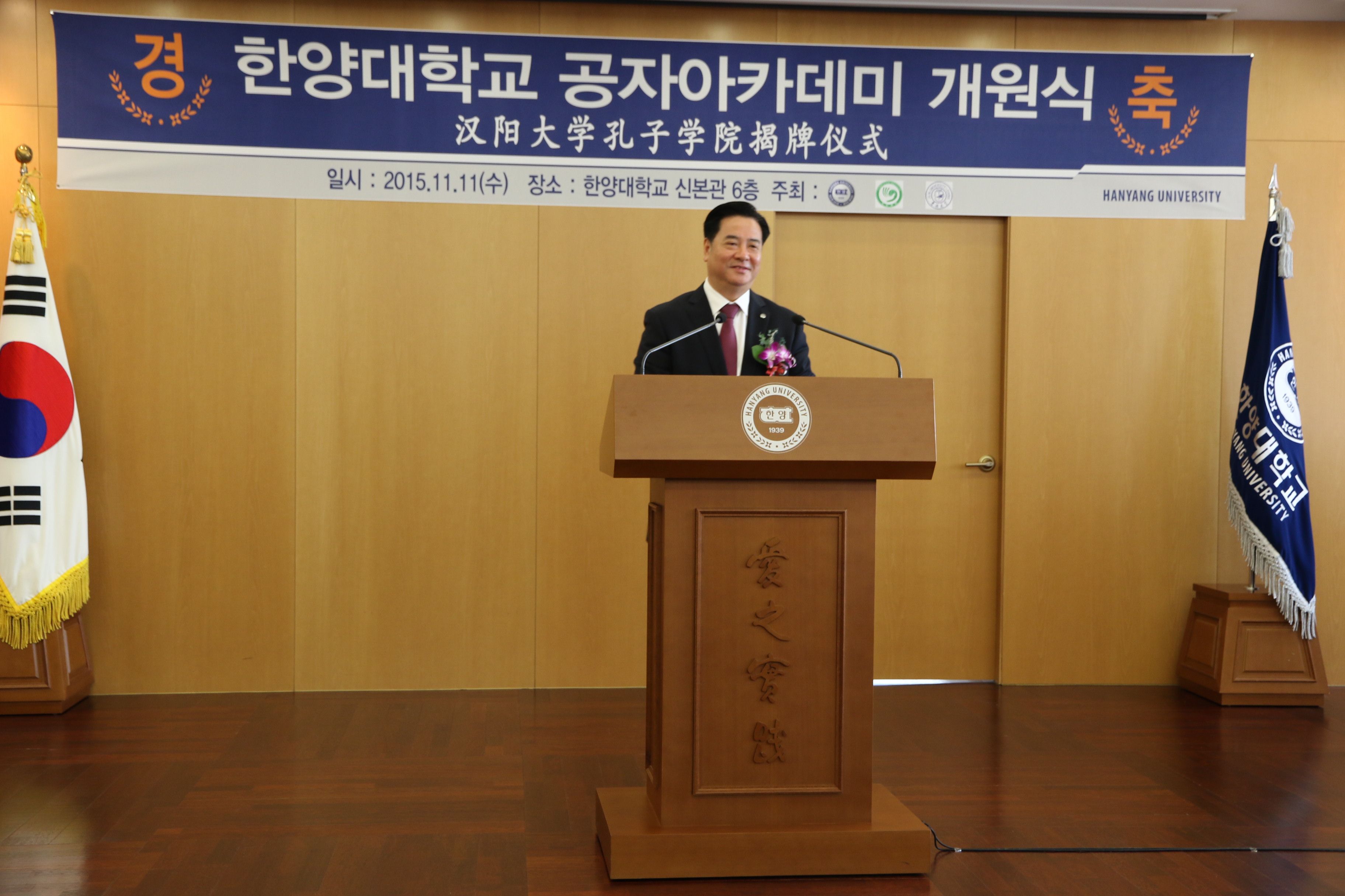 紧接着,在一片热烈的气氛中,汉阳大学孔子学院揭牌仪式隆重举行。李永茂校长在致辞中表示,在当前不可逆转的国际化和全球化的潮流中,“中国”两个字对我们有着格外重要的意义。韩国社会对了解中国社会、政治、经济和文化等领域专家的需求越来越多,汉阳大学孔子学院就是为了这种需求建立起来的。出席揭牌仪式的中国驻韩大使馆艾宏歌教育参赞宣读了国家汉办主任许琳的贺信,并表示作为教育参赞,他将一如既往,支持两校包括孔子学院建设在内的各项合作与交流事业。李元元校长在致辞中说汉阳大学孔子学院是在中韩两国战略伙伴关系进入新时期的形势下成立的。中国国家主席习近平和国务院总理李克强先后访问韩国,朴槿惠总统应邀参加中国纪念抗日战争胜利70周年阅兵式。中韩两国关系进入历史上最好的时期。吉林大学将全力以赴,为满足汉阳大学学生和教师的汉语学习需求,为满足首尔即周边区域了解中国文化的需求,为推动两国之间的深度文化交流,为增进两国人民的友好与互信做出杰出贡献。”