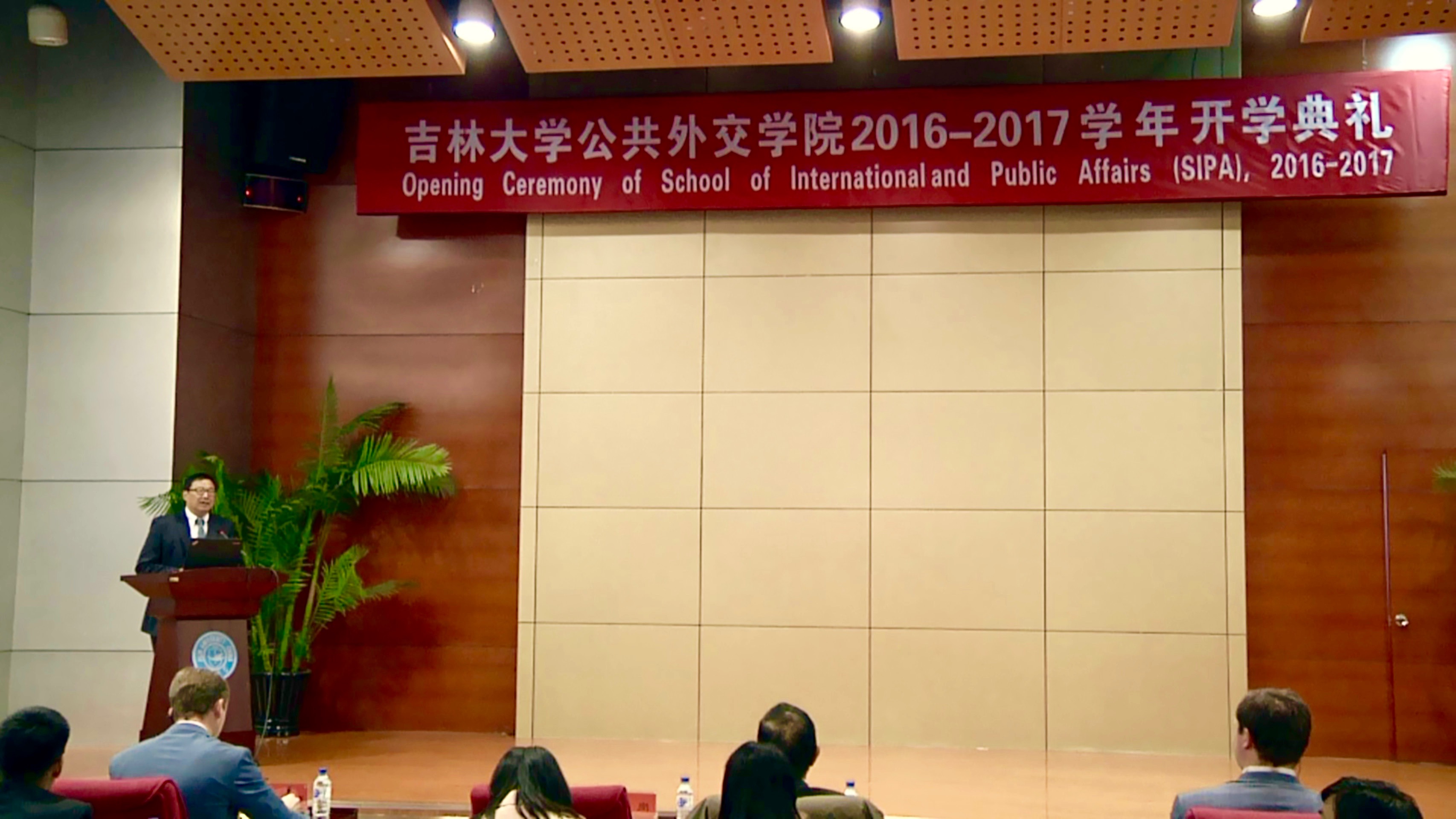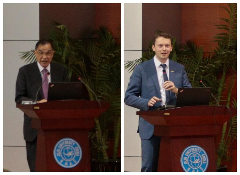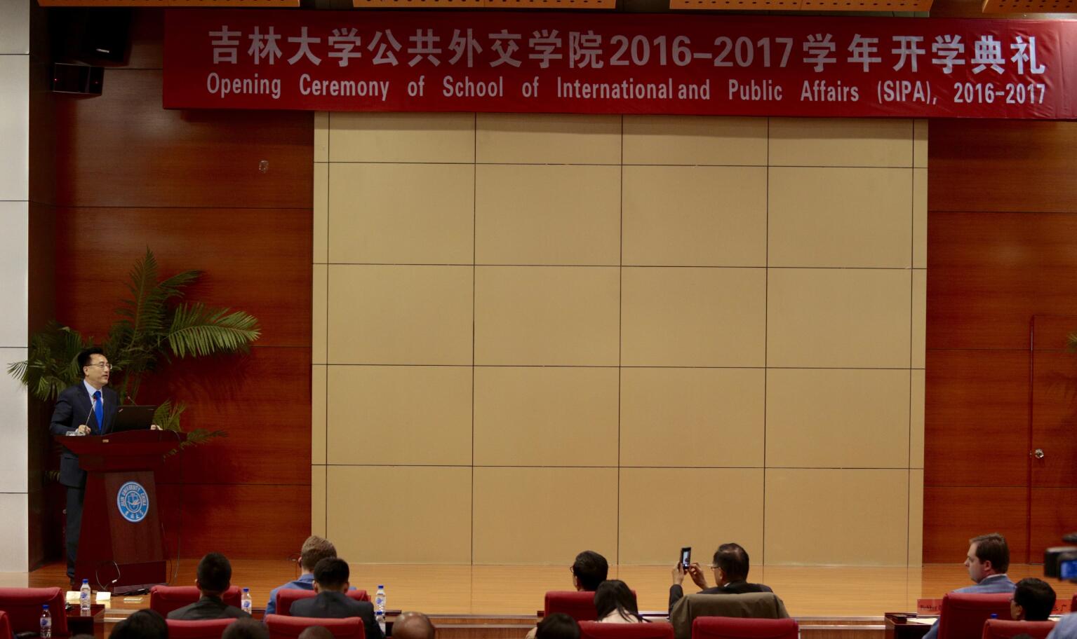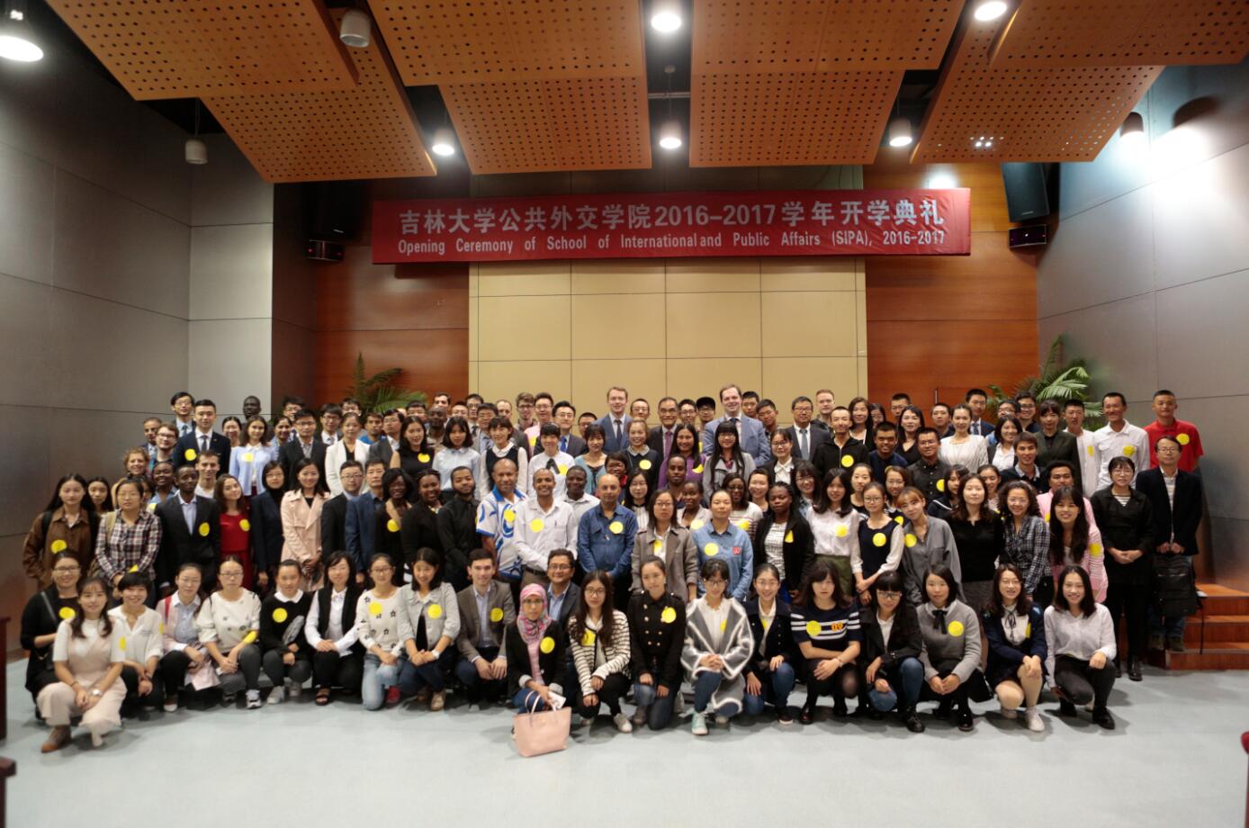 新入学的中国学生和留学生表示热烈欢迎。他指出,在吉林大学建校70周年校庆之际,学校发展进入了一个历史性的新阶段。而公共外交作为一门新兴学科,面对着大量未知的领域和挑战,希望同学们把握时代脉搏,大胆探索,中外学生相互促进,用所学的知识惠及各国人民。中国学生尤其要树立正确的世界观和人生观,成为具有高尚情操的公共外交专门人才,而不能成为“精致的利己主义者”。冯达旋教授则以《文明的碰撞:“一带一路”对人文交流的意义》为题,阐述了自己对“一带一路”的理解和其对沿线国家间人文交流的重要意义,为同学们上了一堂生动的公共外交课程。巴依科夫教授在致辞中首先对吉林大学70周年校庆和熟女