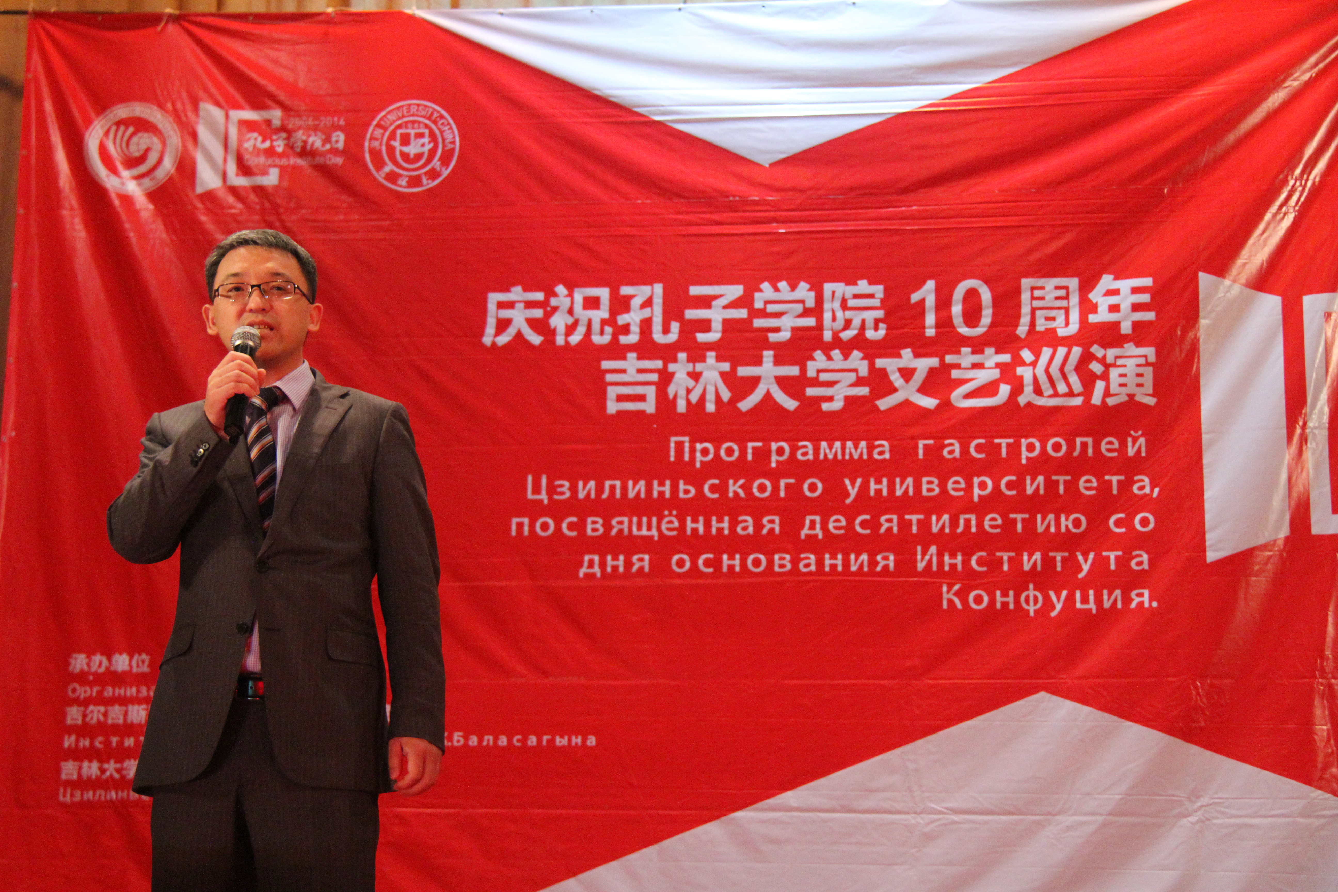 吉尔吉斯斯坦国家议会教科文体主席奥斯曼那里耶夫·卡内别克(Осмоналиев Каныбек)在致辞中讲到:“我刚下飞机就赶到这里和大家一起庆祝孔子学院10周年庆典。教育对于当今社会十分重要,外语教学是其中不可或缺的一部分。汉语教学在吉尔吉斯斯坦的发展得益于中吉的友好邻邦关系,愿两国友谊长存!”中华人民共和国驻吉尔吉斯斯坦大使馆政务参赞任仕说,中吉是友好的邻邦,时逢孔子学院10周年,我们应该发扬孔子的思想,精诚合作共同创造中吉两国美好的明天、美好的未来。