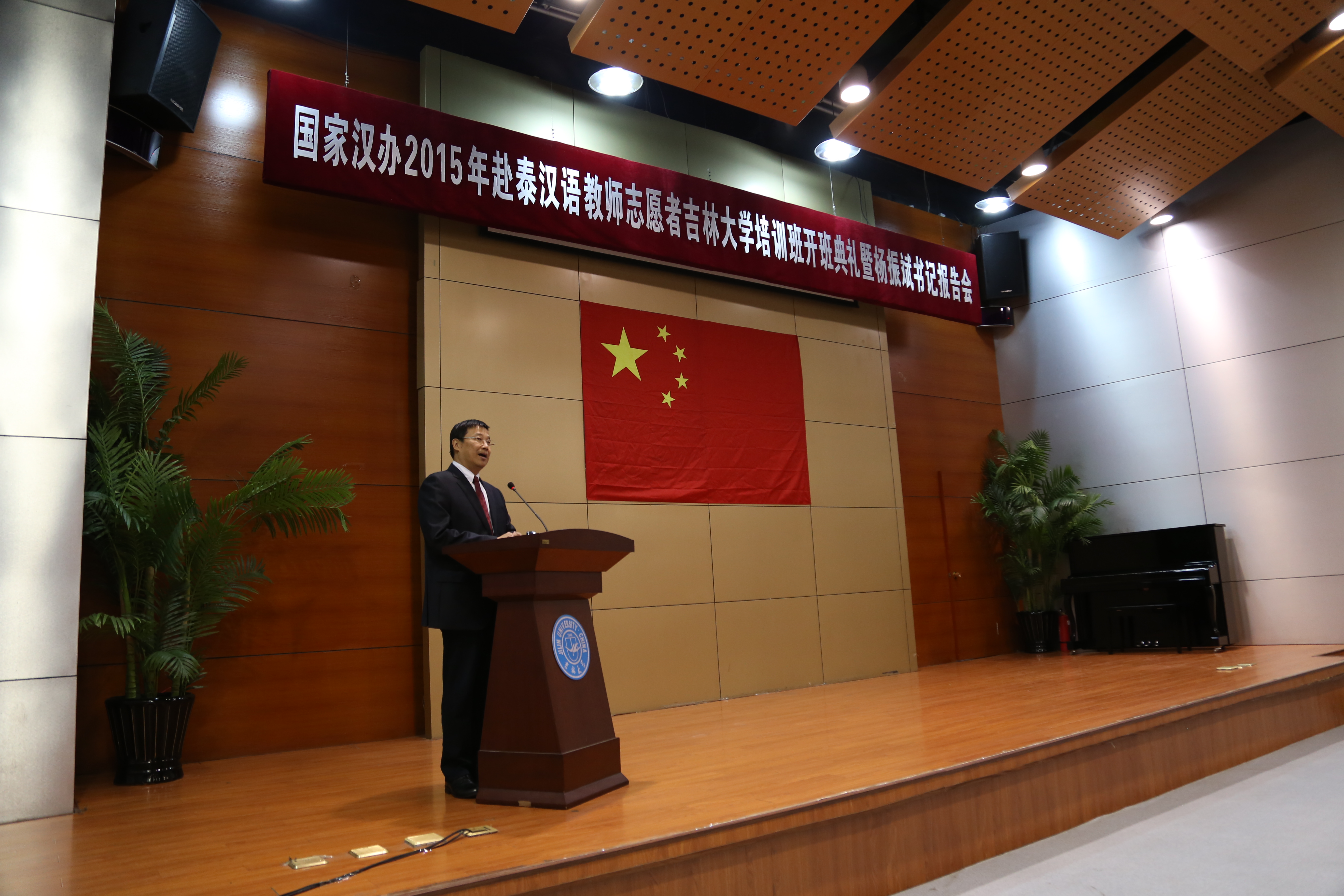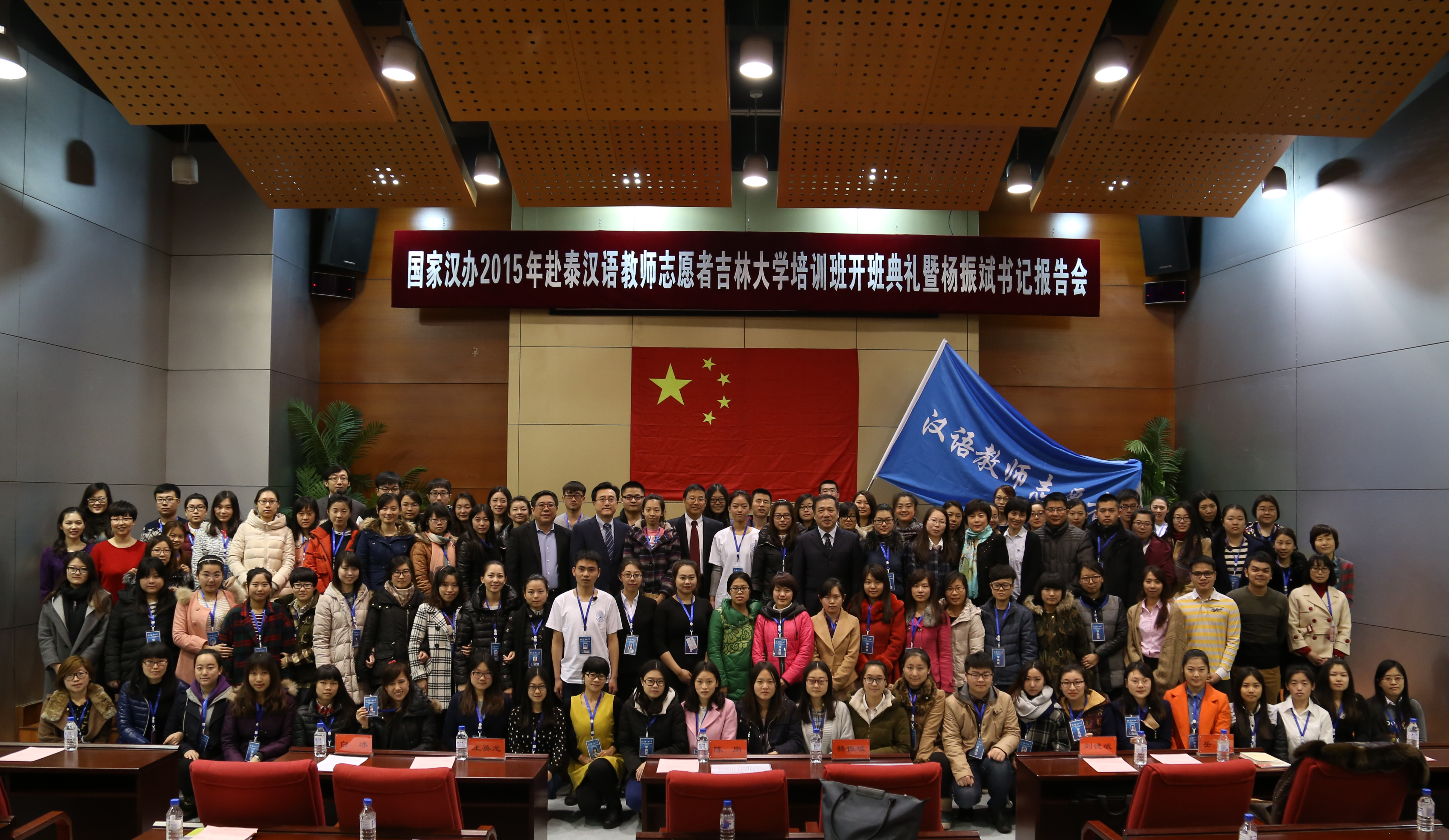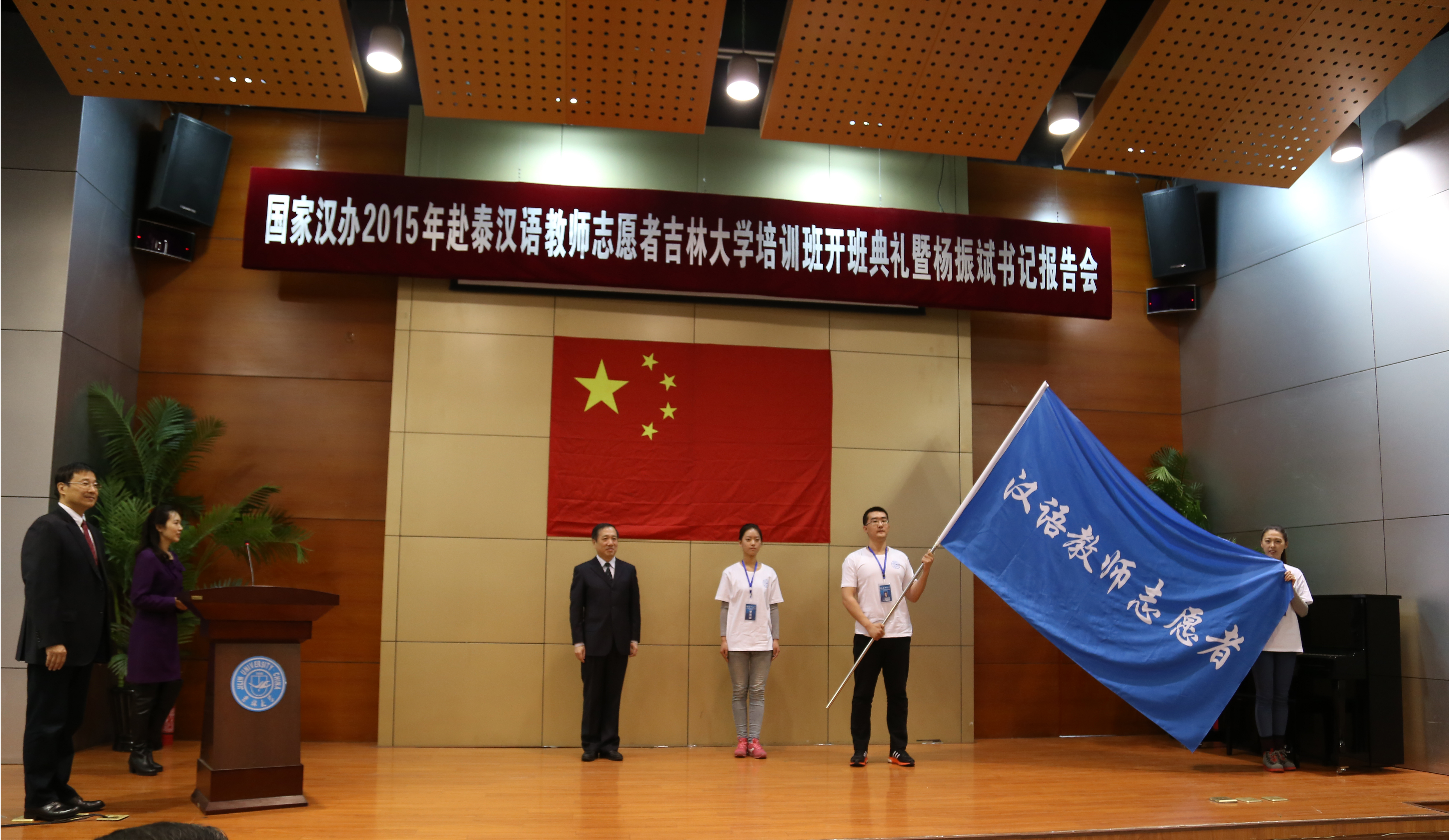 3月12日上午,国家汉办2015年赴泰汉语教师志愿者吉林大学培训班开班典礼在吉林大学国际汉语教育东北基地学术报告厅举行。校党委书记杨振斌为培训班授旗并为培训学员作报告。熟女