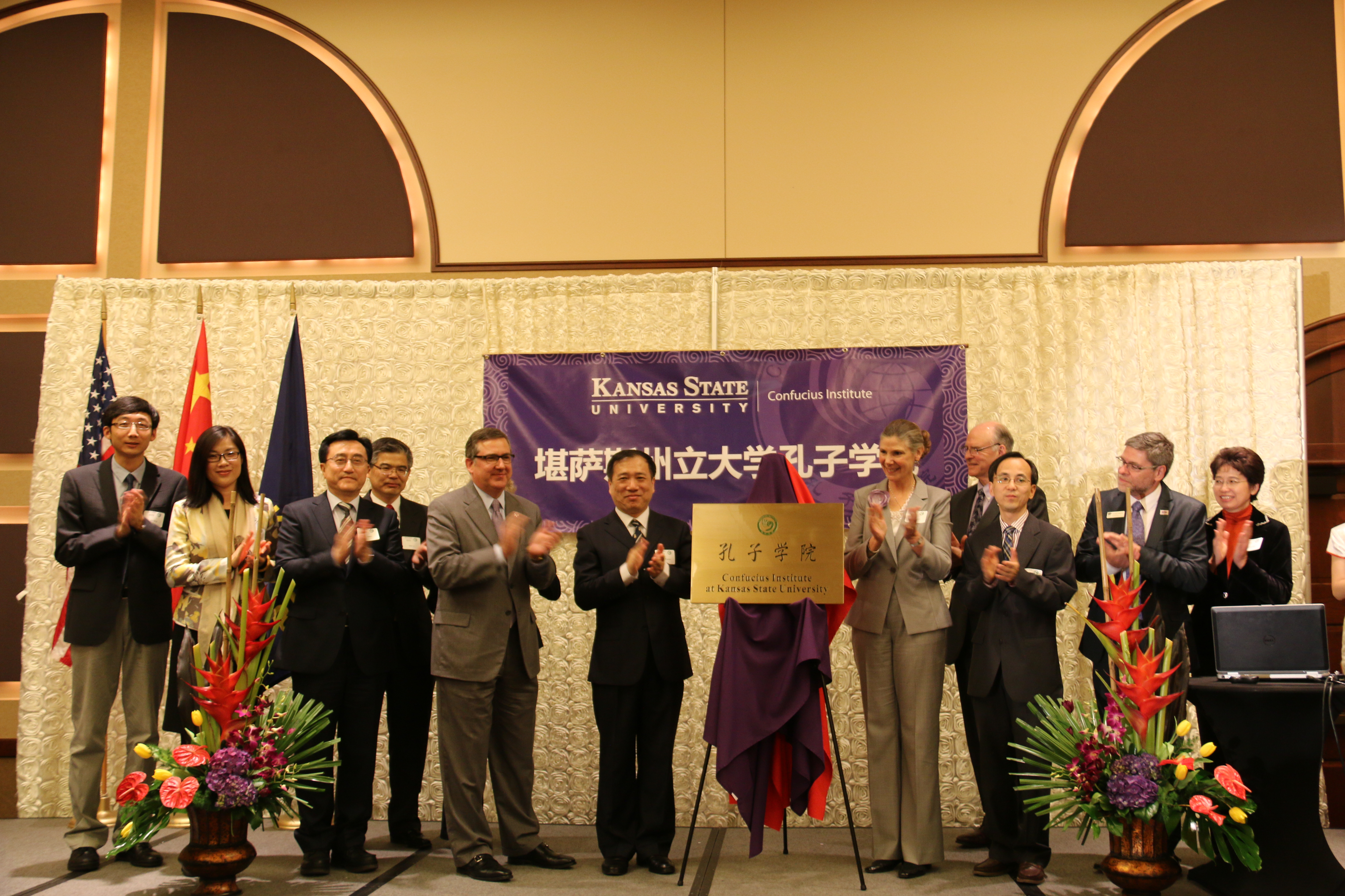 美国当地时间4月7日下午,吉林大学与美国堪萨斯州立大学共建的孔子学院正式揭牌成立。校党委书记杨振斌率代表团出席揭牌仪式并致辞,堪萨斯州立大学校长柯克·舒尔茨(Kirk Schulz)、教务长兼常务副校长艾谱莉·梅森(April Mason)、中国驻芝加哥总领事馆刘军副总领事、堪萨斯州政府代表等共150人参加了揭牌仪式。仪式由堪萨斯州立大学主管国际事务副教务长马萨罗·萨巴提斯(Marcelo Sabates)主持。国家汉办主任许琳专门发来贺信。