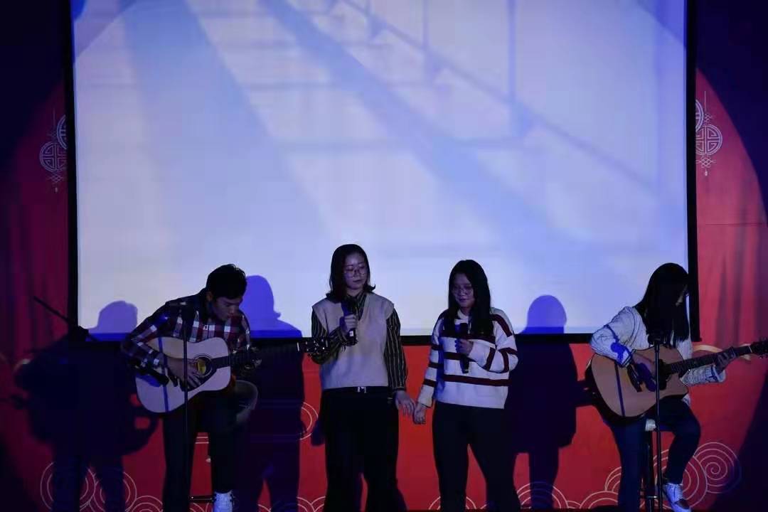 丁思然,王妍和化学学院特邀嘉宾杨博珵等同学带来的吉他弹唱《旖旎冬月》带我们进入了静谧醉人的世界。期待的都能得到,失去的都能释怀,愿世间的所有美好,与你环环相扣。