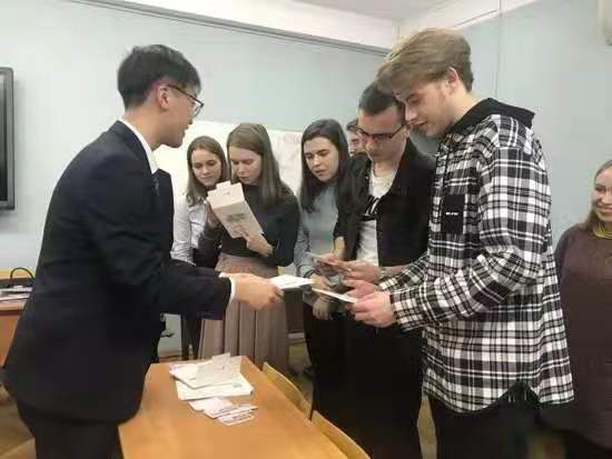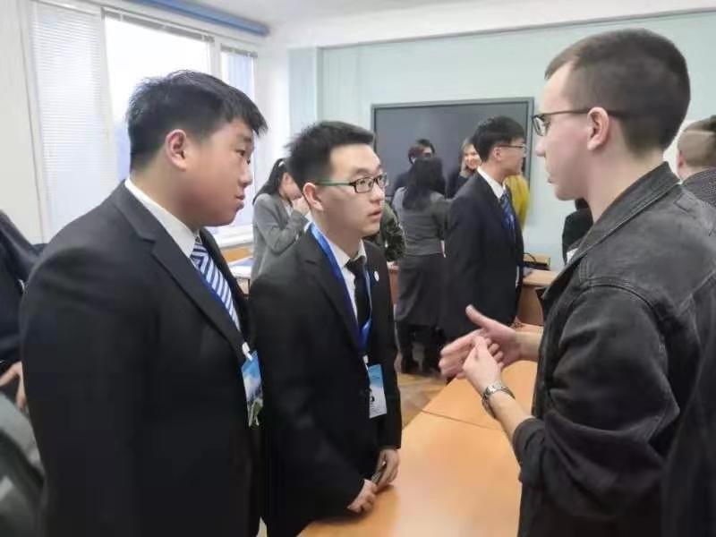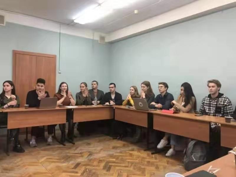 学生进行探讨,刘治辰、胡帅等同学从不同的角度对此进行了解答。张词含、李峥榕等同学也提问向对方了解世界政治系在招收国际学生、推动青年交流方面的具体措施,卡佳老师及娜塔莉娅主任回答了学生们关心的问题,世界政治系的学生们谈了自己的感受。双方师生就中俄两国能源合作、媒体网络对于塑造中俄两国形象、汉语教育在俄罗斯大学发展情况、莫大国际组织人才培养经验等多方面展开了深入交流。