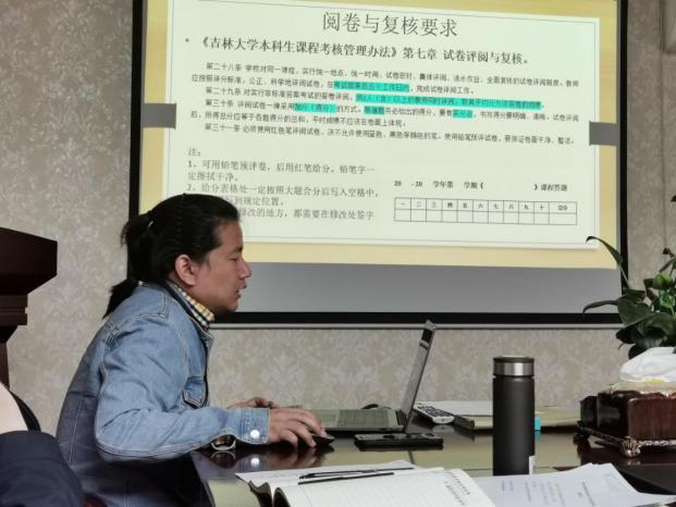 第一,理顺工作流程,进一步提高课程考核工作质量。学院教务与科研办公室主任孟翔冲老师向参会教师反馈了校级督学试卷检查的情况。根据试卷检查过程中发现的问题,孟老师就《吉林大学本科生课程考核管理办法》中的相关规定向参会老师做了详细的讲解,主要包括期末考试命题的要求、监考人员守则、试卷评阅与复核、试卷分析、复核制度等。参会教师们针对具体规定进行了深入讨论,对完善课程考核相关工作流程提出了具体的意见和建议。大家表示将严格遵守学校和学院的规定,进一步提高考试出题及试卷管理工作质量。