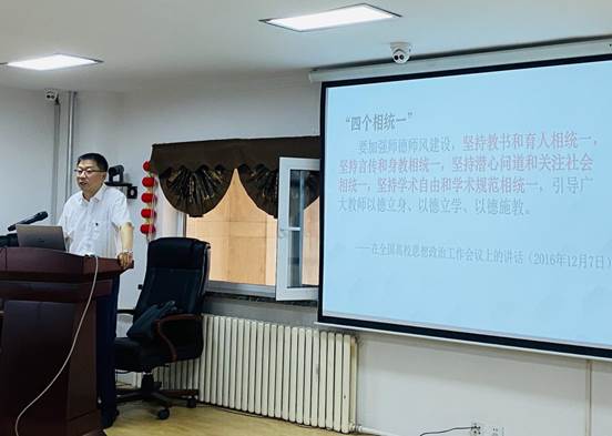 随后,杨民书记以“明师德要求,遵师德规范,做新时代‘四有’好老师”为题展开专题教育。他与全体教职工一同再次重温了习近平总书记关于师德师风的系列重要论述;带领大家重新学习了教育部、学校关于师德师风建设的重要文件,就重点内容结合实际案例一一进行讲解;就师德师风、思想意识形态、保密纪律要求及相关工作报备审批程序进行着重提醒。