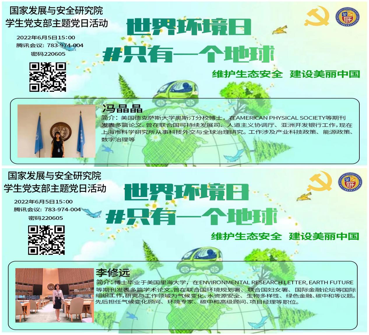 6月5日,国家发展与安全研究院学生党支部以“维护生态安全,建设美丽中国”为题召开线上主题党日活动。此次活动特别邀请原国际金融论坛环境专家、联合国环境规划署、妇女署顾问李修远博士和上海市科学学研究所研究员、原联合国可持续发展司职员冯晶晶博士后参会分享,熟女