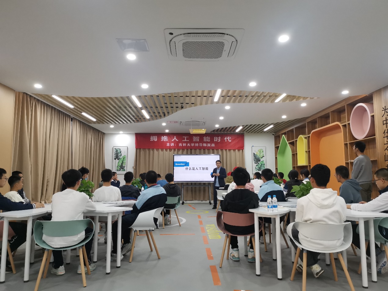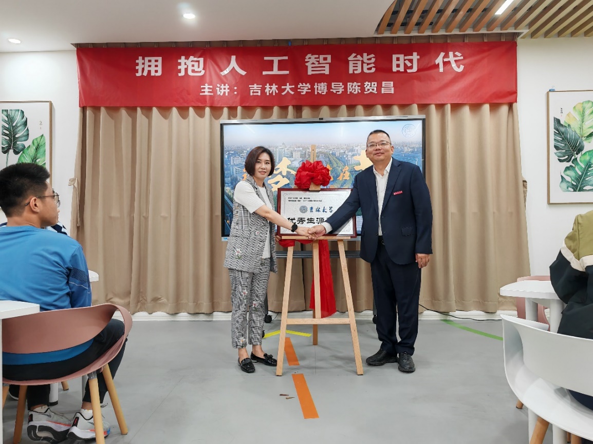 刘丽副书记代表吉林大学向厦门市翔安中学授予“吉林大学优秀生源基地”牌匾。陈贺昌老师以“拥抱人工智能时代”为主题向与会师生介绍人工智能的发展简史、战略地位和未来趋势,并介绍吉林大学人工智能学院的办学理念、师资团队和学生培养等内容,得到了较好的反响。