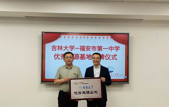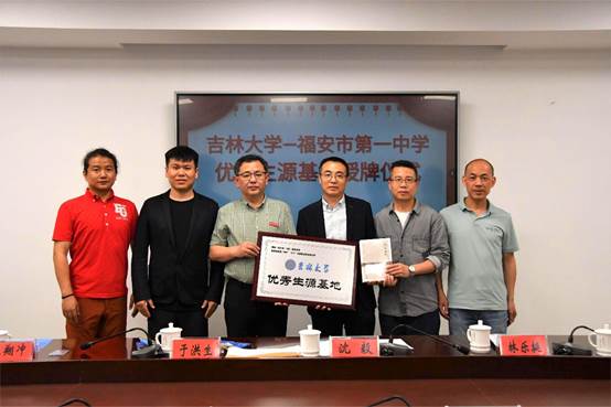 招生团组感谢福安一中对学生培养的高度重视,并代表吉林大学向福安一中授予“吉林大学优秀生源基地”牌匾。陈雄校长与于洪生副院长就学校生源、人才培养、报考情况等亲切交流并合影留念。