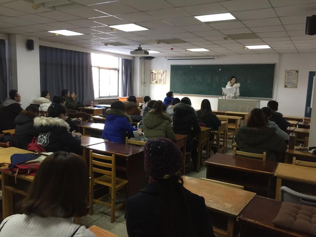 辅导员老师参加大一新生班级诚信考试教育年级会,强调考场纪律和考试要求,希望同学们在大学第一个期末考试里,能够全心投入,认真备考,劳逸结合,取得良好成绩。