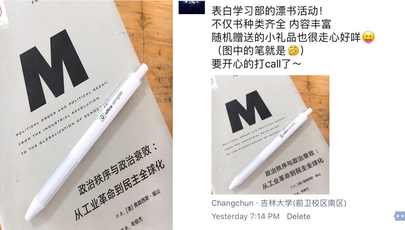 活动开始不久,大二的袁梦同学借阅了弗朗西斯·福山教授的《政治秩序与政治衰败:从工业革命到民主全球化》,她表示:“我一直都对福山的思想很感兴趣,这本书思想深刻,封面大方简洁,希望我可以早日看完,再来借阅!”袁梦同学还获得了读书月“图书漂流”活动特别小礼品一份,她评价道:“实用,可爱,使用感好。”