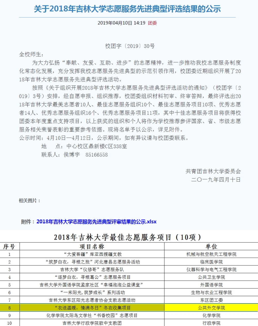组织开展的“衣送温暖,情满冬日”冬衣收集项目,被评为吉林大学年度最佳志愿服务项目(全校10项)。