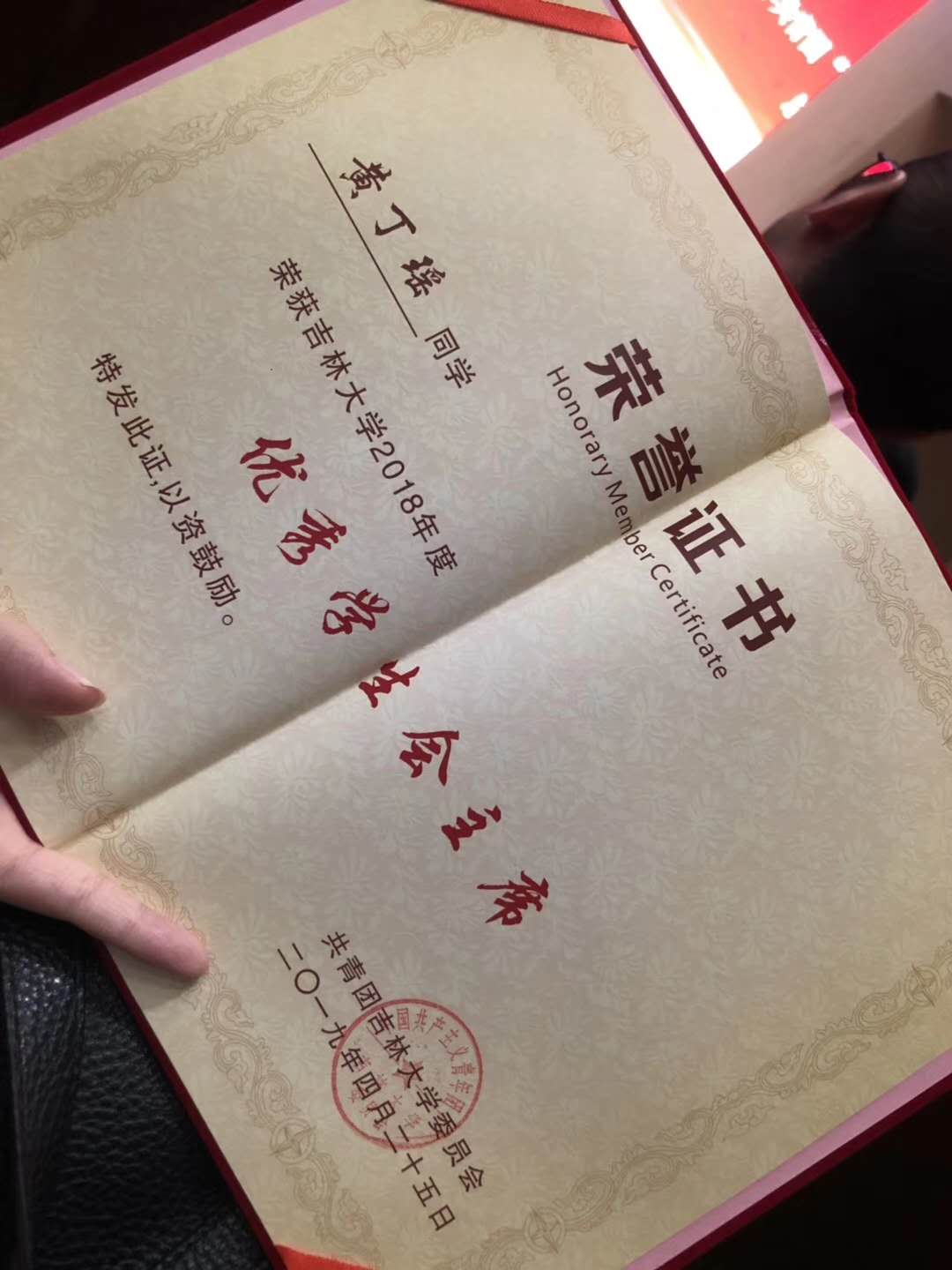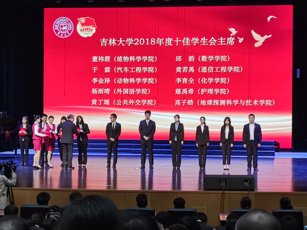 在吉林大学共青团“纪念五四运动100周年”总结大会暨“我和我的祖国”主题合唱展演活动中黄丁瑶同学被授予2018年度十佳学生会主席荣誉称号。