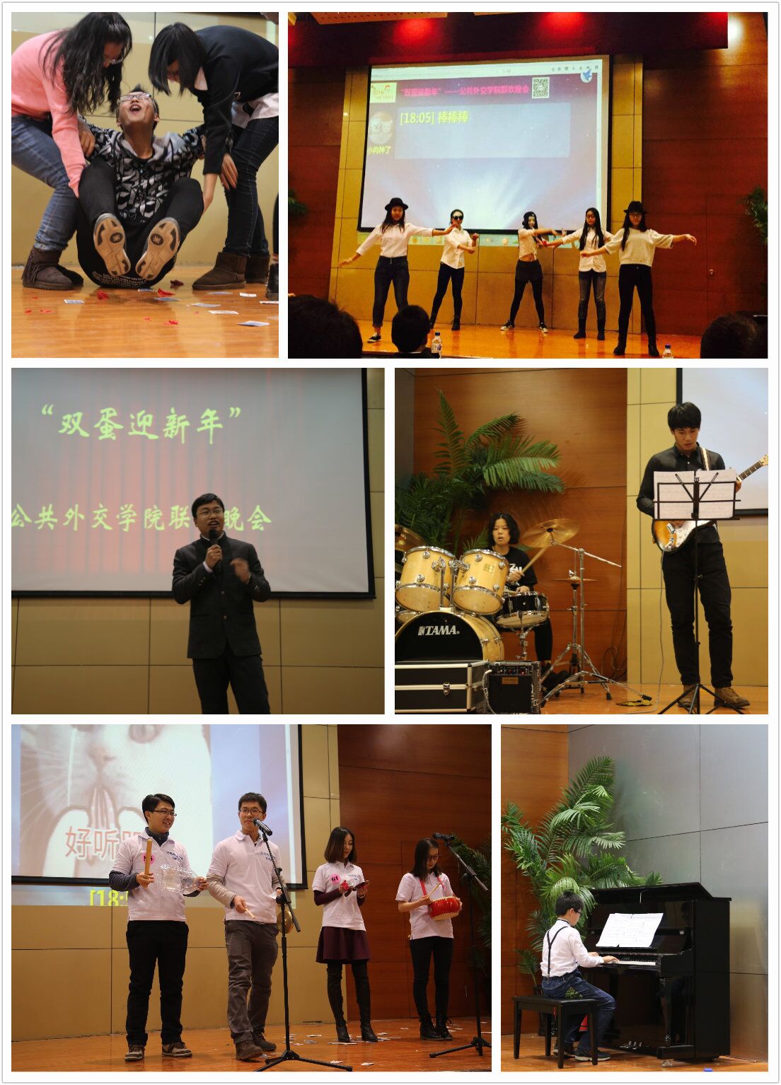 晚会由各位教师精心录制的新年祝福视频开篇,同学们在惊喜之余也倍感温暖。晚会期间,劲歌热舞,引爆全场;乐队云集,演绎精彩;情景剧、三句半,逗乐开怀。有小朋友的钢琴演奏,悠扬流畅,萌翻全场,更有奇幻近景魔术,技惊四座,令人赞叹。微信墙、游戏、抽奖增加了观众的参与感,为晚会增色不少。最后,由王文奇老师自创的相声《强词夺理》压轴出场,将晚会推向高潮。