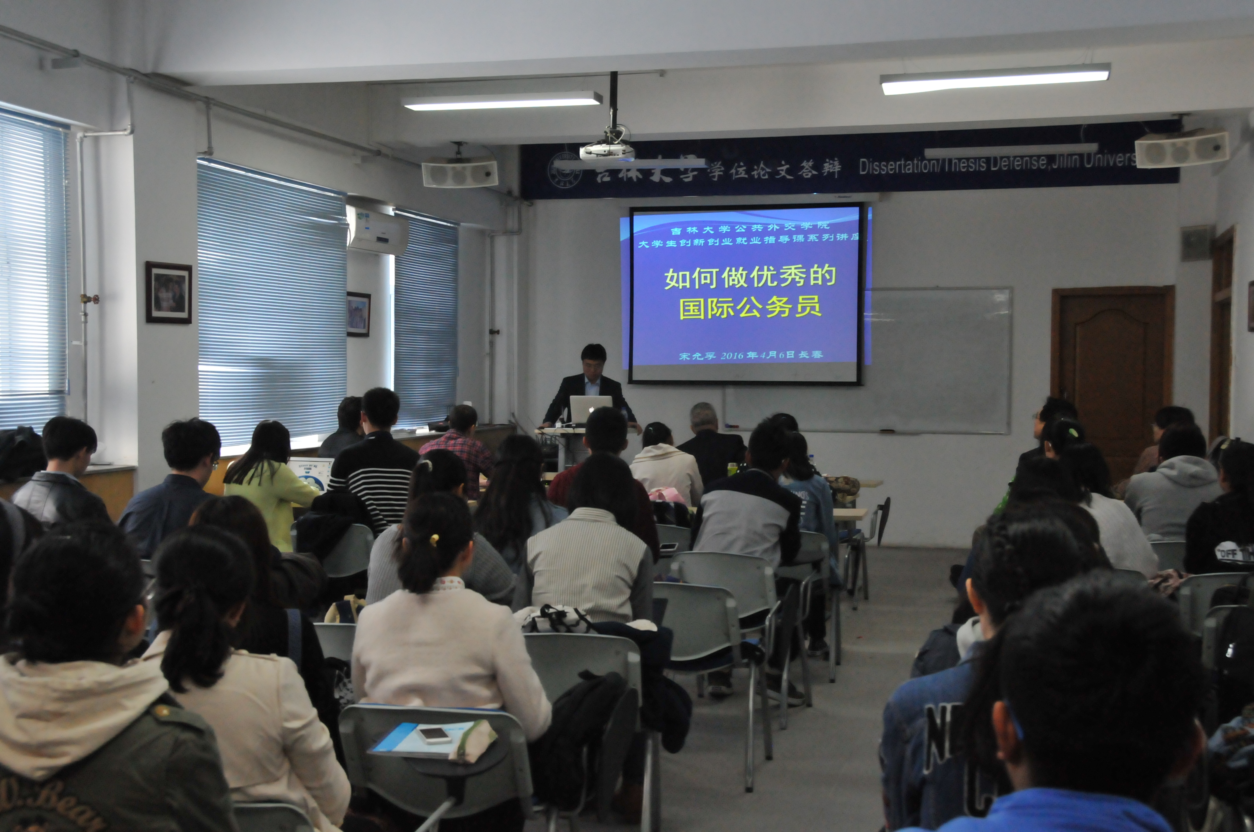 学生讲解如何成为一名合格的国际公务员。在介绍与国际公务员相关的信息 同时,宋司长着重强调了作为国际公务员应具备的精神、素养及能力。宋司长表示,身为一名国际公务员,应时刻心系祖国与人民,始终铭记自己的行为是代表着祖 国利益,在工作中应做到有度,有界,有担当。同时还要具备“卡尖斌”的精神:能上能下,能小能大,能文能武,力求展示自己最良好的面貌,让人民放心,为国 家争光。