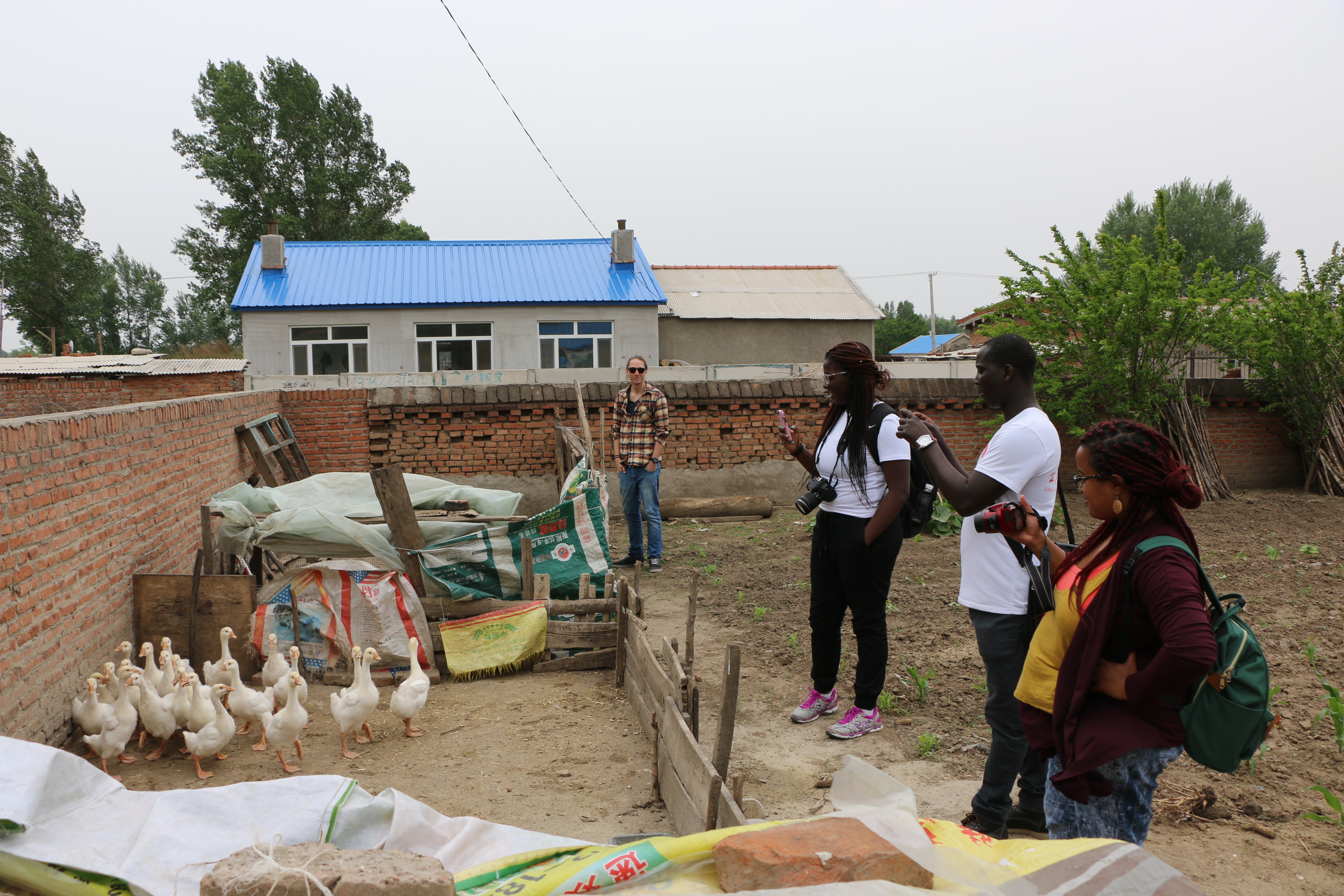 随后,我们一行人来到了村头的几户农户家中参观。加拿大留学生兴致勃勃地交流着中国农村与加拿大田园景象的不同,好奇地东瞅瞅,西望望;看看鸡,看看鸭。在自由参观阶段,两位来自里贾纳大学的同学坦言,虽然中国的农村环保工作仍有待加强,但他们喜爱中国乡村生活的恬静以及人们的朴实与好客。