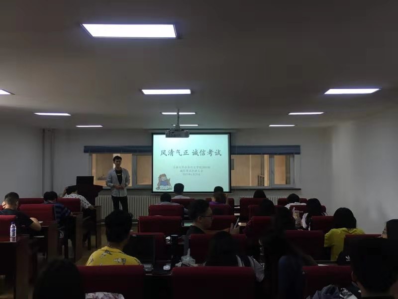 会上,各班级学习委员分别宣读了《吉林大学本(专)科学生考试纪律规范》及《吉林大学考试规则》,与会同学认真倾听。宣读完毕后,同学们共同签署考试诚信承诺书,以此约束自己严格遵守学校考试规范。考试期间,学院领导和辅导员分别到各年级考场进行巡考,严明考风考纪。
