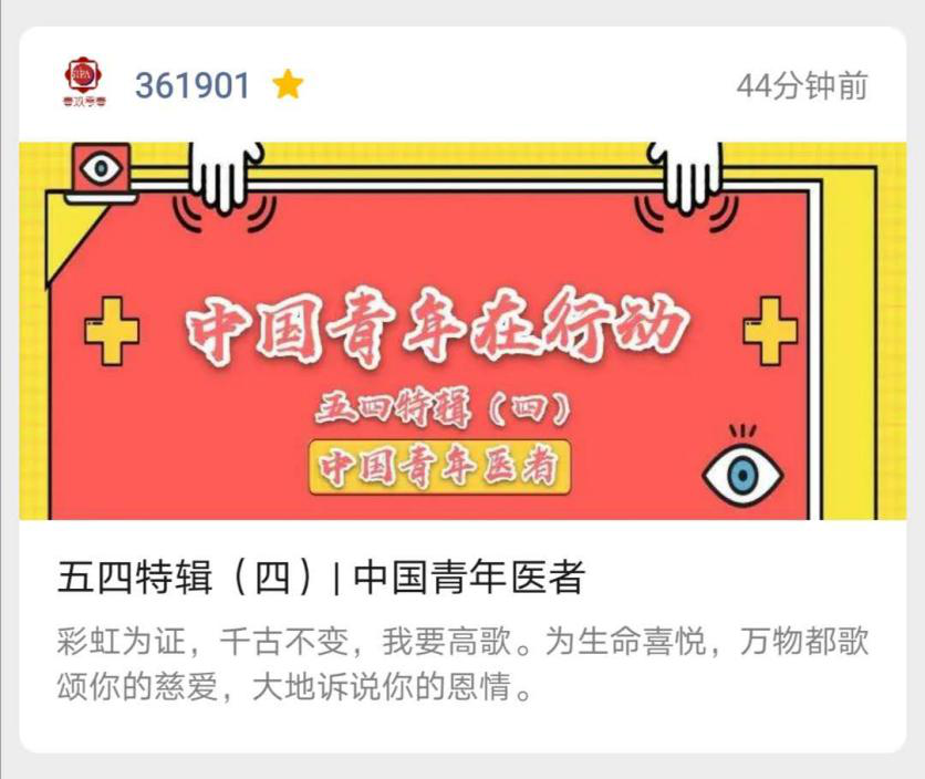 山川异域,风月同天。疫情期间,无数青年人站了出来,他们或许只是各行各业的平凡工作者,或许只是学生,但是他们不甘于袖手旁观。也正是因为有了他们,我们在抗疫过程中又多出了一道道坚实的防线,又有了一个个坚实的后盾。今年的五四青年节,让我们大声的歌颂有担当、有情怀的中国青年们!