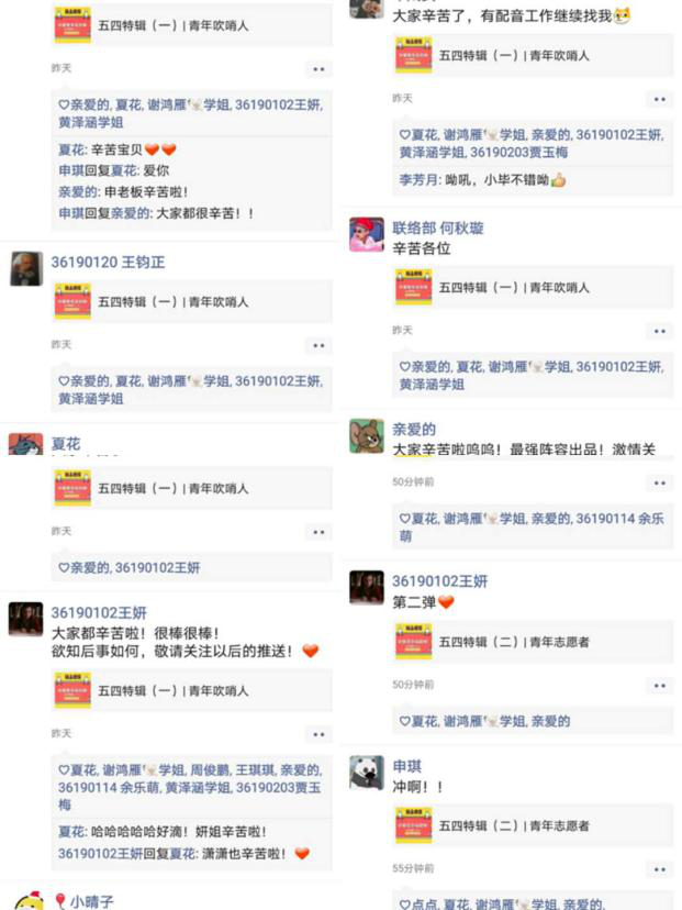 李宸偲:本次活动将五四青年节与抗疫相结合,着重关注到了青年在疫情期间的责任与担当。在素材收集与文案写作的过程中,我对青年们的事迹有了更丰富的了解和更为深刻感悟。他们也许只是平凡的青年,但是在不平凡的时刻义无反顾地站了出来。他们是80后,90后,甚至只是00后,他们在家中也是父母心疼的孩子,可是疫情面前,他们披甲上阵,成为了一道不可攻破的防线。在这次活动中,大家一起准备,一起泪目,也一起探讨身为青年的我们可以怎样践行自己的责任与担当。这次活动中我收获颇多,它帮助我明确了自己身为青年在当下,在未来应该培养的素质与应当践行的责任。