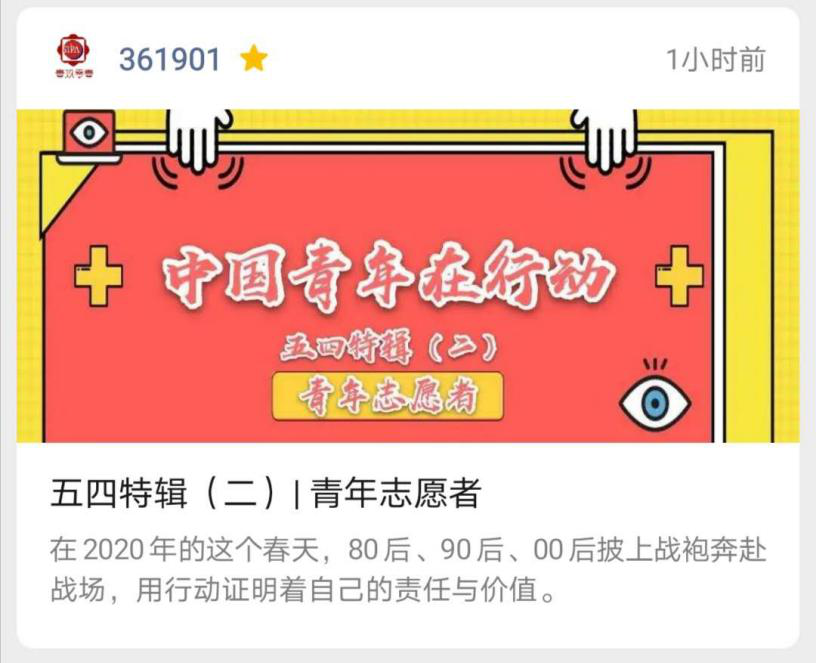 青年志愿者重点讲述了来自五湖四海、各行各业的青年们积极投身抗疫的故事。他们或许是雷神山火神山以及方舱医院的青年建设者,或许是快递小哥和外卖配送员,又或许是在校的大学生们,在这个春天,他们都披上战袍奔赴战场,用行动证明着自己的责任与价值。