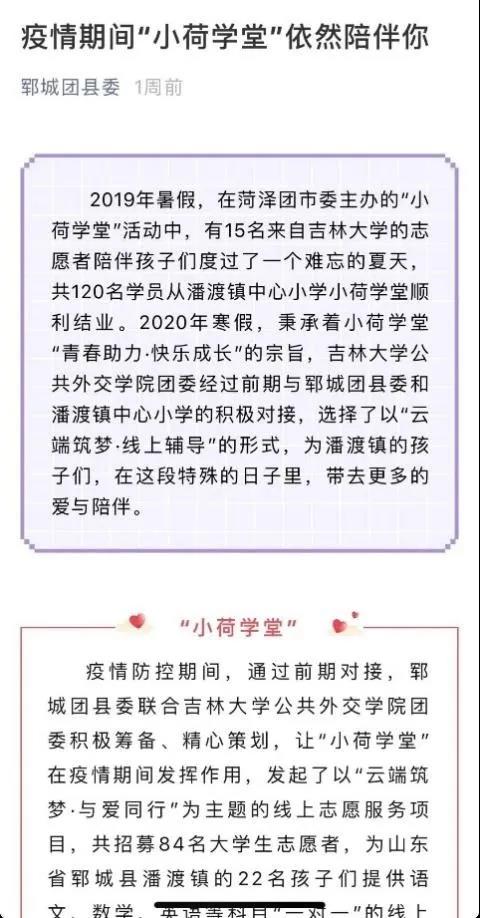 本项目既是对支教地学生线上学习的有益补充,又是对“互联网+志愿服务”的一次积极探索,获得了来自学生、家长及社会的多方肯定。山东省郓城团县委在3月13日于微信公众平台发布“疫情期间,‘小荷学堂’依然陪伴你”推文,对本次活动进行了专题报道。山东省郓城县潘渡镇中心小学专门向熟女