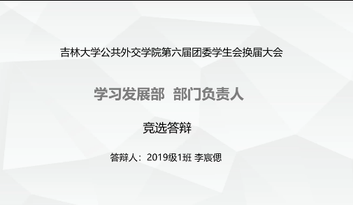 大会第一项是竞聘人答辩,由第五届团委学生会主要学生干部担任评委。11名竞选人依次进行了竞聘答辩。竞选人从岗位理解、工作经历回顾、社会实践与志愿服务经历、自身所获荣誉以及未来工作展望等方面做了汇报并回答了评委的提问。每一位竞选人的竞选答辩都表现出对学生工作的热爱和对未来工作的信心,充分展现了当代大学生积极进取的品质。