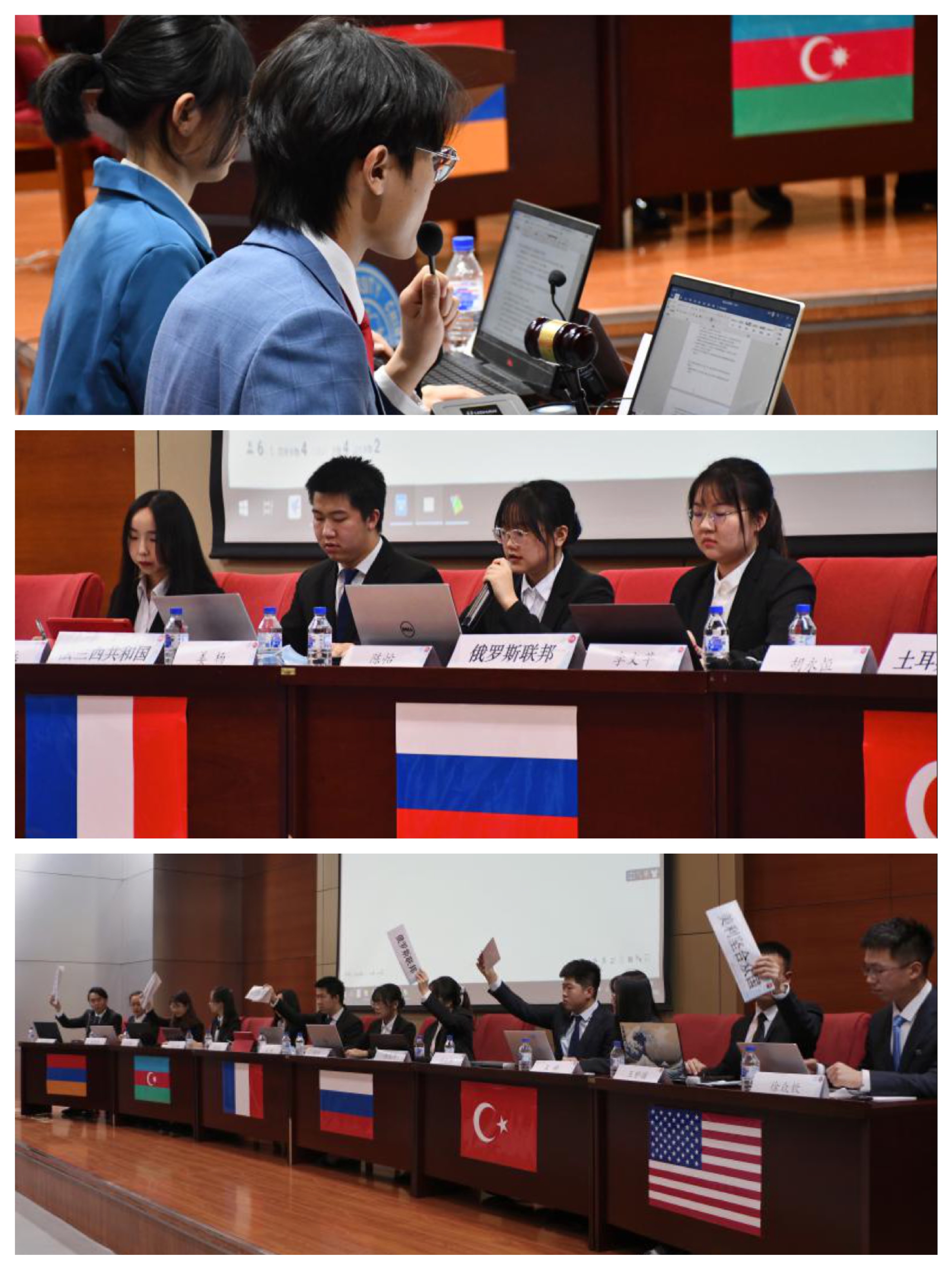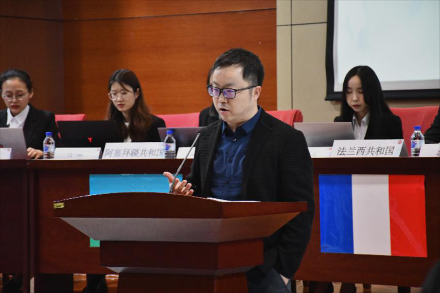 颜震老师致开幕词。颜震老师从历届大赛背景、外交谈判的重要意义、以赛促学等角度让大家对外交谈判以及比赛本身有了更加深刻的了解。此次大赛共有来自六个学院的12名选手参加,采用双代表制,设亚美尼亚共和国、阿塞拜疆共和国、法兰西共和国、俄罗斯联邦、土耳其共和国、美利坚合众国六国席位。各国代表在正式谈判环节据理力争,努力捍卫国家利益,经投票表决通过大会最终《决议草案》。在危机处理环节,各国代表面对评委老师现场投票决定的危机,沉着冷静,展现了良好的临场反应能力和危机处理能力。