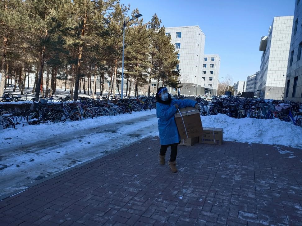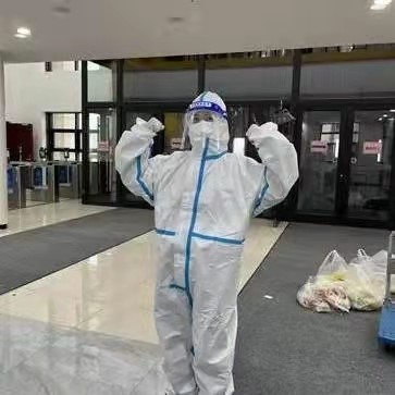 张淑艳老师在前一阶段负责南苑九公寓。在驻楼期间,每日配合楼长的工作,完成整个楼的各项服务同学的事务;同时张淑艳老师需要24小时保持高度紧张,一旦来消息,随时给大家提供特别妥善的处理。在撤出南九后,张淑艳老师被调到物资保障组,每日随叫随到,指哪打哪,为不同寝室楼搬运所需物资。由于运输外来物资,必须全副武装以后在搬运物资,在搬运物资过程中经常整个人会汗流浃背。