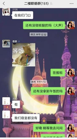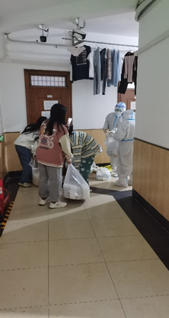2020级本科生田园在接受采访时表示:“寝室实行封闭管理以来,我光荣成为一名志愿者,作为南苑九公寓二层的负责人,参与南九的防疫调度工作。每天我的核心任务只有一个——确保南九二层的每一位同学都能按时拿到餐食、物资,顺利完成核酸检测。每次敲门时,寝室内传出的一声声‘辛苦啦姐妹!’就是我最大的快乐和最温暖的鼓励。到了晚上,一天的餐送完之后又开始召集第二天的志愿者......每天都是满满当当却充实有意义的时光。岁月因青春慨然以赴而更加静好,世间因少年挺身向前而更加瑰丽。共盼凛冬散尽,静候春暖花开。非常感谢同学们的理解,我们会努力做得更好的!”