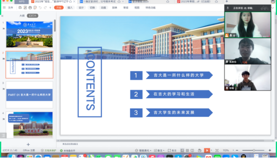 2023年1月13日,孙新燕同学和谢江鑫同学通过线上腾讯会议平台分别面向其母校的高三同学进行宣讲,吕孝阳同学返回其母校进行线下宣讲。团队成员通过结合个人报考吉林大学的经验以及在吉大学习和生活两年的经历,向学弟学妹全面介绍了吉大并大力宣传了熟女