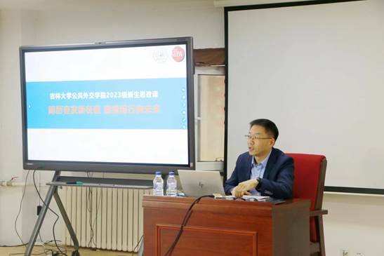 杨民首先对2023级新生的到来表示热烈的欢迎,希望同学们要尽快适应由高中生向大学生的身份转变,顺利开启崭新的大学生活。杨民从学校历史出发,为同学们详细介绍了吉林大学的优良传统和基本情况,鼓励同学们以先辈为榜样,赓续红色血脉,传承吉大精神。接着,杨民结合学院的基本情况,详细阐释了学院的办学理念和办学目标,鼓舞同学们踏实学习,用实际行动践行“世界眼光、家国情怀”的院训。随后,杨民详细介绍了新时代中国特色社会主义建设取得的伟大成就以及中国特色社会主义进入新时代的重大意义,并希望同学们牢记党的教诲,把握时代机遇,立志民族复兴。最后,杨民寄语同学们要树立远大理想、热爱伟大祖国、培育担当意识、磨练意志品质、提升个人修养,努力成为“信念坚定、学识扎实、为人朴实、作风踏实”,具有“世界眼光、家国情怀”的SIPA人。