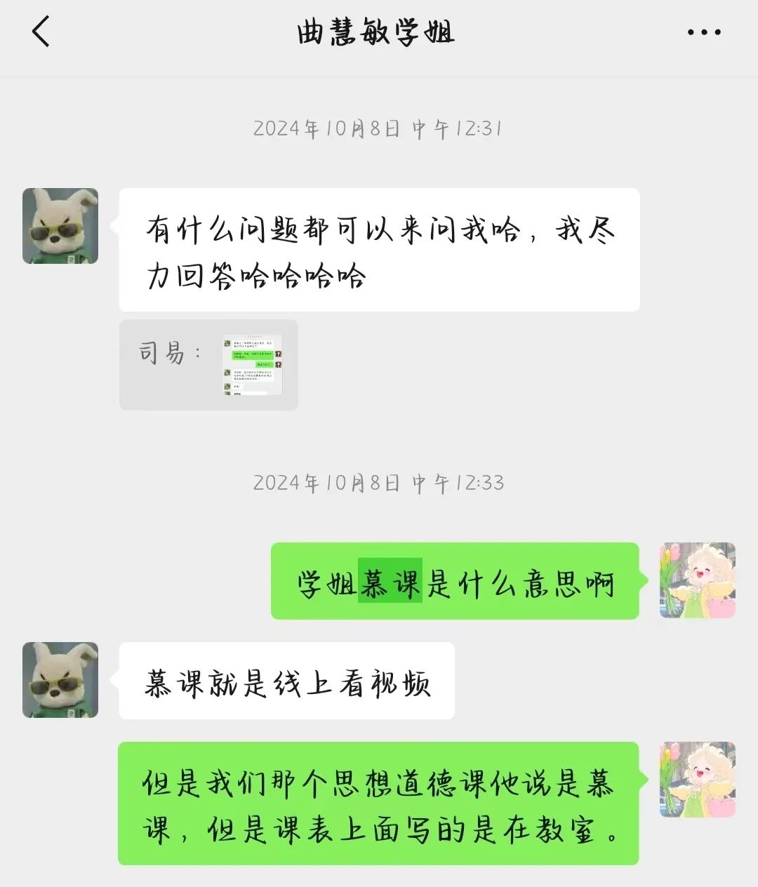 学姐非常认真细心地回答我的问题,从专业课到公选课,从学习到日常生活,为刚上大一有许多迷茫困惑的我解决了问题并指明了方向,我在学姐的帮助下也顺利的度过了大一上学期,感谢学伴活动让我有机会向学长学姐取经,谢谢学姐的帮助与鼓励。