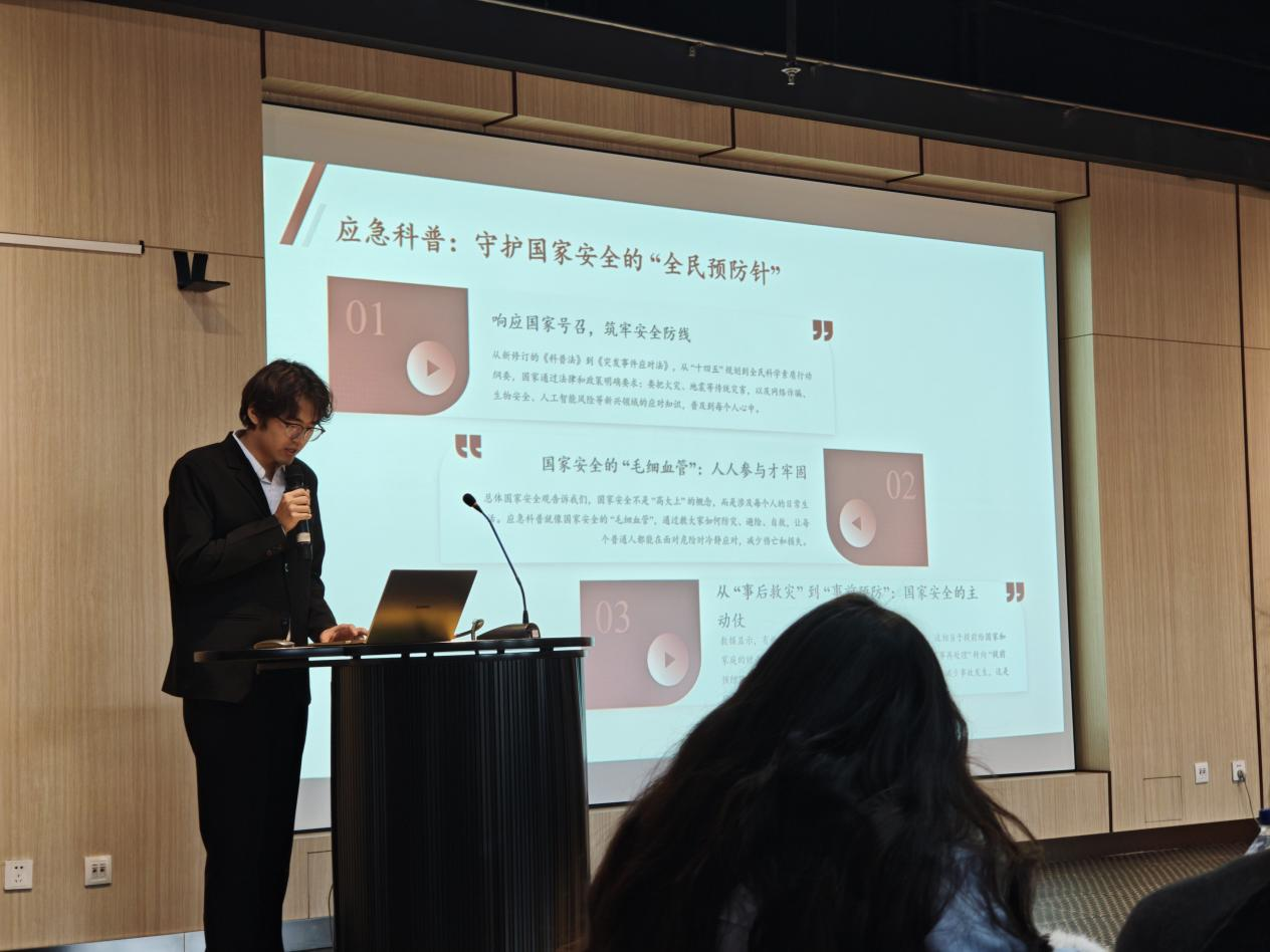 主题发言环节,来自新疆大学的金冠杰同学以“国家安全教育视域下新时代应急科普发展的多维实践进路”为题,从人民安全的视角讲述了新时代我国应急科普的要求、问题挑战及实践路径,既彰显了百年未有之大变局下应急科普的紧迫性,更展现了青年学生立足国情、脚踏实地的研究精神。