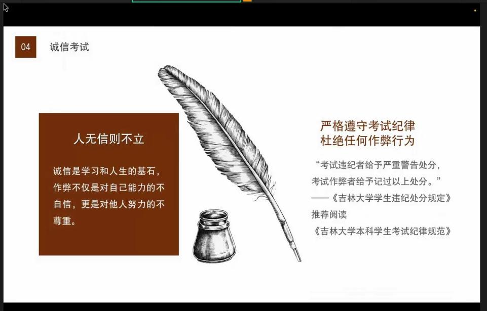 首先,首先,曲慧敏提醒同学们要从思想上重视考试,并向同学们介绍了自己“计划+执行”双轮驱动复习方法,鼓励同学们合理规划时间,形成适合自己的复习节奏。随后,她建议同学们在复习之余,留出时间进行适度运动、聆听音乐或与朋友交流,以舒缓压力。最后,曲慧敏结合《吉林大学违纪处分规定》《吉林大学本科学生考试纪律规范》说明了学校对于考试作弊行为的处分规定,并提醒同学们自觉维护考场公正,共同营造公平、健康的考试环境。