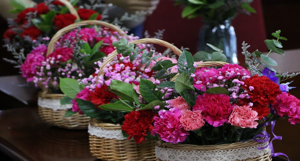 与此同时,学院妇委会为参加培训的教职工精心备好了插花材料:花篮、剪刀、洋牡丹、非洲菊、玫瑰花、满天星、尤加利叶、雪叶莲……教师们在周老师的指导下认真修剪,精心构思,尽情地发挥创作力,根据不同的色彩、形状,错落有致、色彩纷呈地将花材搭配在一起,变成了一件件具有艺术感、层次感的精美作品。